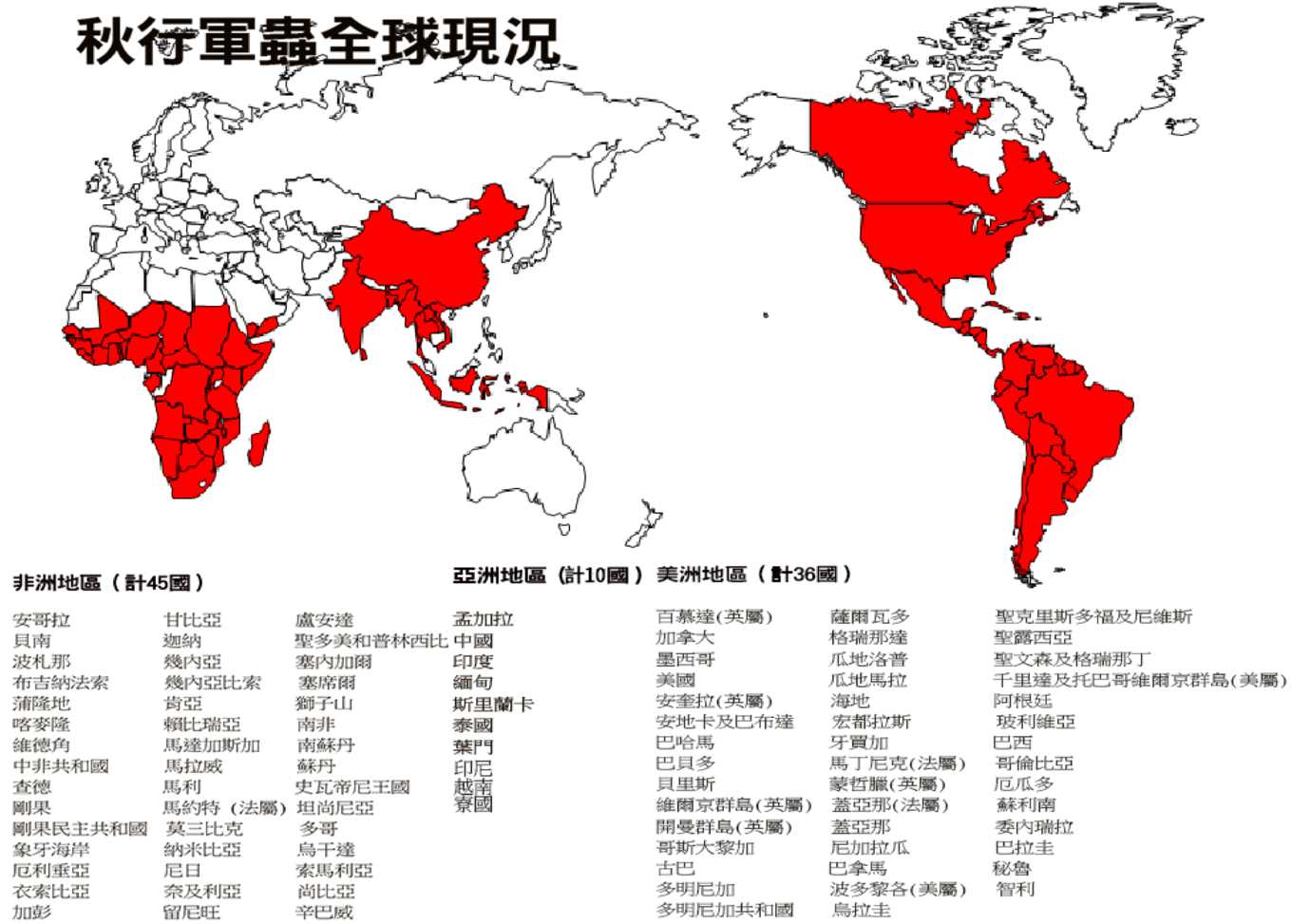 秋行軍蟲在全球多國肆虐,對禾本科農作物(除了蕎麥以外,幾乎所有的糧食都是禾本科植物,如小麥、稻米、玉米、大麥、高粱等)傷害很大,目前中國已有18個省份淪陷。台灣自8日出現首例後,今(12)日也相繼確認宜蘭頭城鎮、嘉義鹿草鄉(備註:原刊登「嘉義縣義竹鄉」,6/12日晚間22點農委會更正為「鹿草鄉」)皆有秋行軍蟲現蹤,發現地田區隨後已遭封鎖、銷毀。