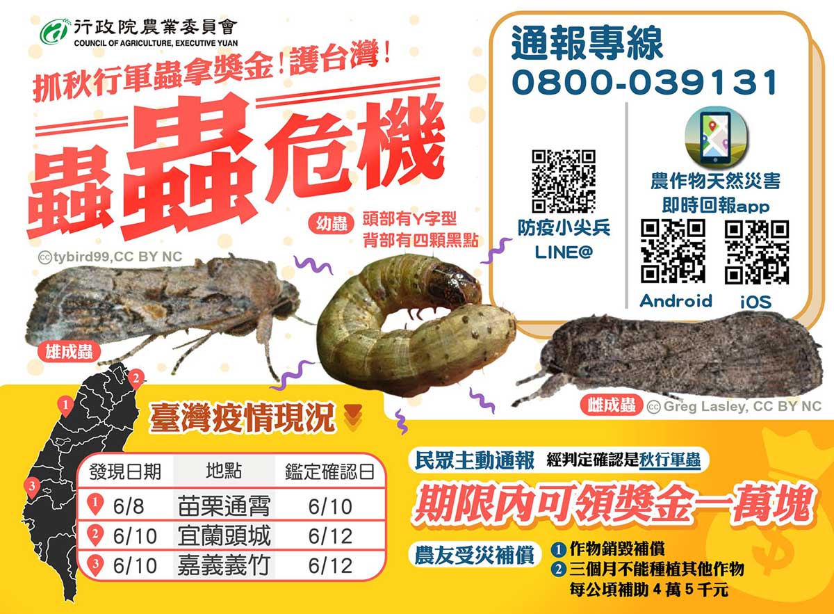 應變小組強調,目前秋行軍仍是第一代幼蟲,有賴農民和民眾迅速通報殲滅,為達成及早發現及早防疫的目標,掌握防治關鍵期,昨日也公布提報獎金每例一萬元。