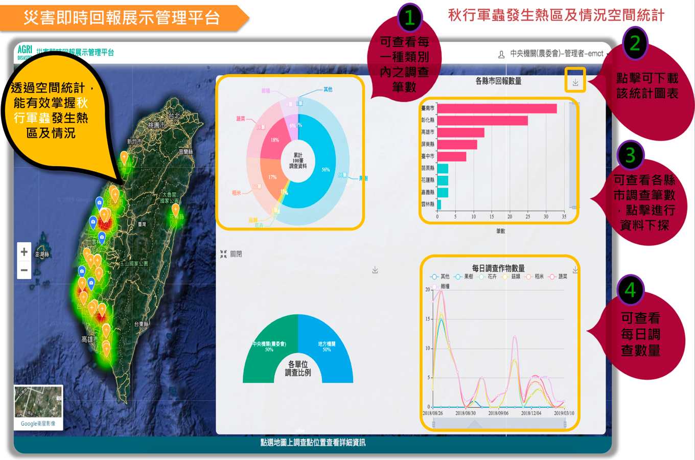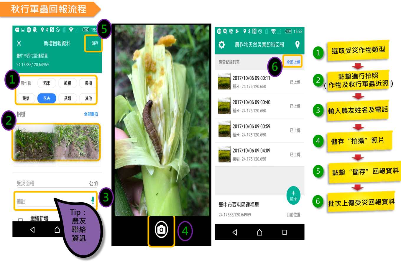 陳駿季進一步解釋操作方式,安卓和蘋果的手機都能使用,只要打開手機,搜尋並下載「農作物天然災害即時回報」手機APP,完成安裝後,登錄時選擇「農委會」,並以通用密碼「0000」(四個數字零)登入,即可進入系統。之後點選「新增」進行秋行軍蟲通報,就可以拍照上傳。