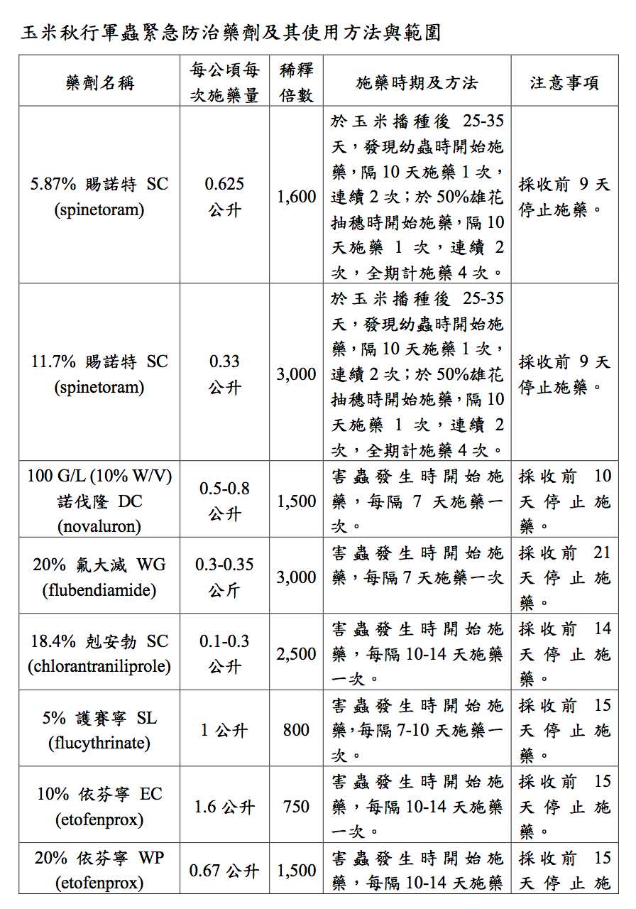 國際認證的農業害蟲秋行軍蟲正式在台登陸,在苗栗、宜蘭與嘉義的玉米田相繼確認秋行軍蟲入侵後,行政院今(12)日下午緊急召開首次「中央及地方秋行軍蟲災害應變小組」跨部會會議,進一步確認秋行軍蟲防治的標準作業程序,並規劃通報獎金和提供案例確認後的補償制度。